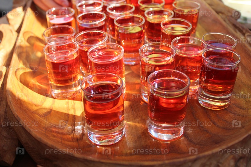 Красный напиток, сок, настойка, алкоголь в маленьких стаканчиках, стаканах. алкогольные напитки алкоголизм домашний алкоголь лечит традиции