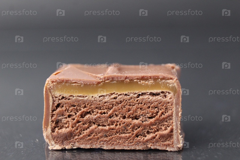 Шоколадные конфеты с шоколадной начинкой Нуга с карамелью на черном фоне крупным планом. Квадратная конфета в разрезе. Крупный план поедания сладких дневных сладостей
