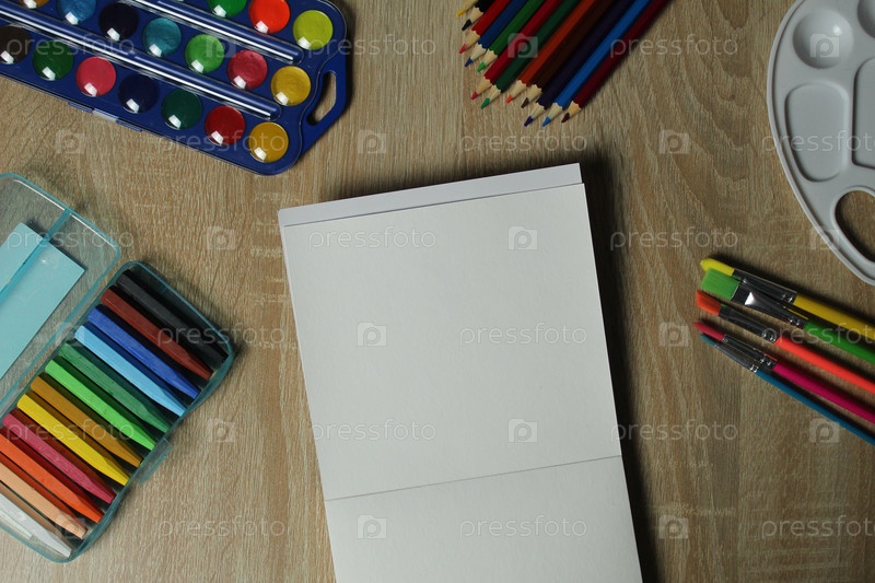 Раскладка школьных принадлежностей для рисования: карандаши, фломастеры, акварельные краски и бумага для рисования на коричневом столе с местом для текста, копировальным пространством. Рисование красками, подготовка к школе, творчество