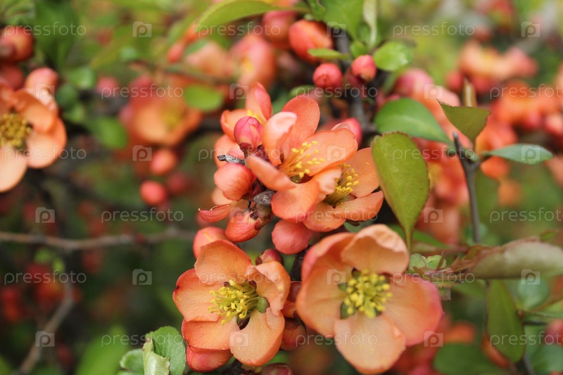Айва японская хеномелес хеномелес маленькие оранжевые цветки на ветке. Весна, цветение, цветение, цветы, лето