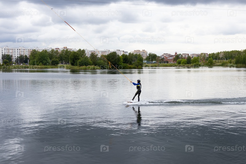 Девочка катается на доске по воде, вейкскейтинг (вейкбординг) на озере напротив пейзажа с зелеными деревьями, водный спорт - Санкт-Петербург, Россия, Июль 2023