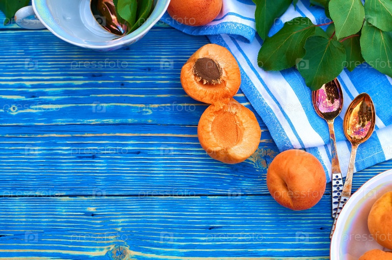 Свежие оранжевые абрикосы на синем деревянном фоне с половиной косточки. салфетка, ложки и зеленые листья. вид сверху