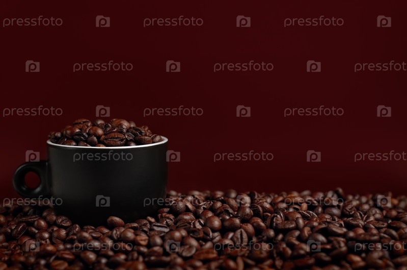 Жареные кофейные зерна на столе и в чашке напротив коричневого фона. Копировать пространство