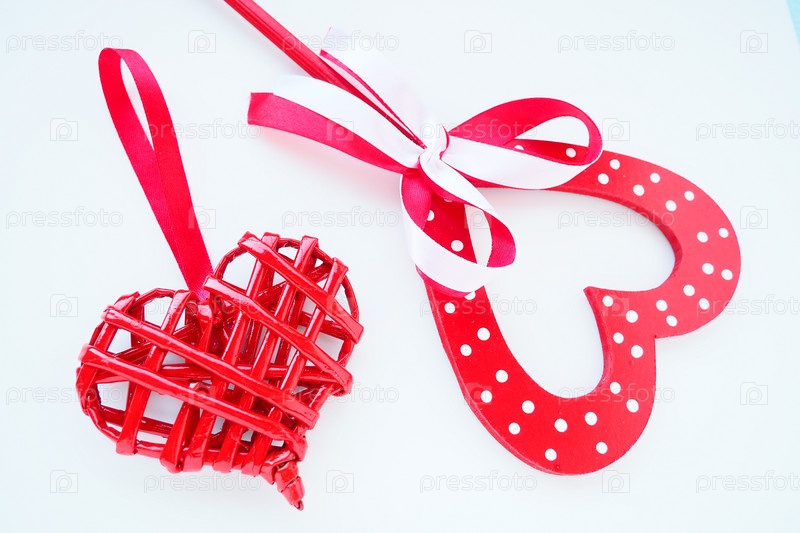 Концепция Дня святого Валентина. Два красных сердца. Деревянное сердце с белыми точками и бантом из ленты на палочке. Плетеное сердце с петлей. Белый фон. Плоская планировка