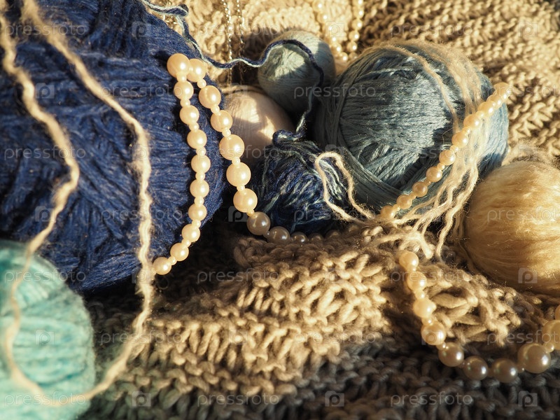 Отрезки пряжи и ниток на фоне вязаного изделия. Бежево-голубые цвета из шерстяных и акриловых ниток. Жемчужные бусины лежат на шариках. Натюрморт