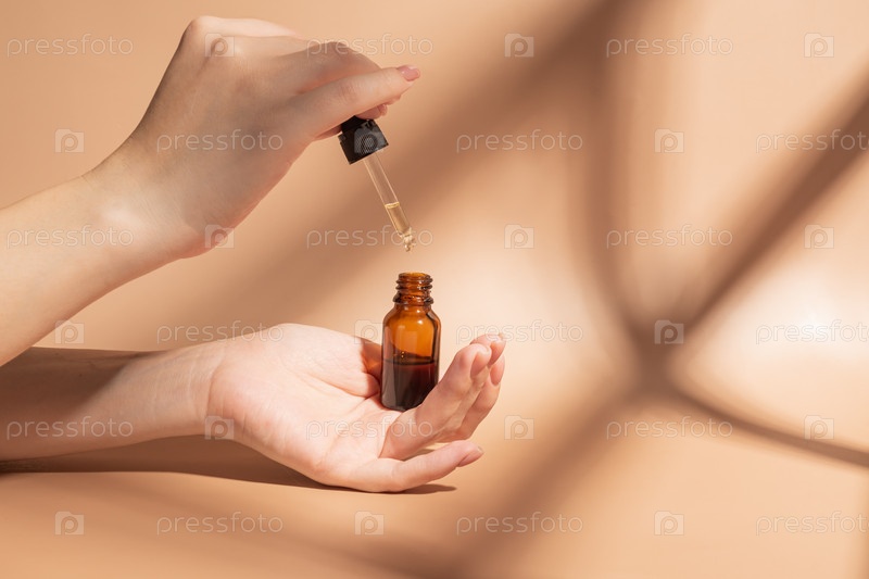 Флакон-капельница из янтарного стекла с косметической сывороткой в женских руках. Женщина наносит на кожу косметическое масло. Обычная процедура ухода за кожей