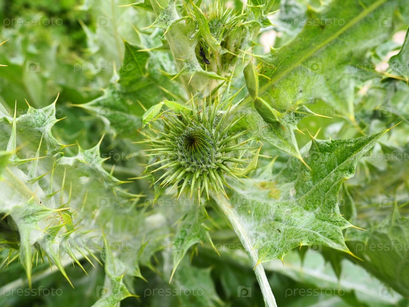Тернистое растение крупным планом. Сочно-зеленые листья с острыми краями. Природа Балканского полуострова. Флора Европы