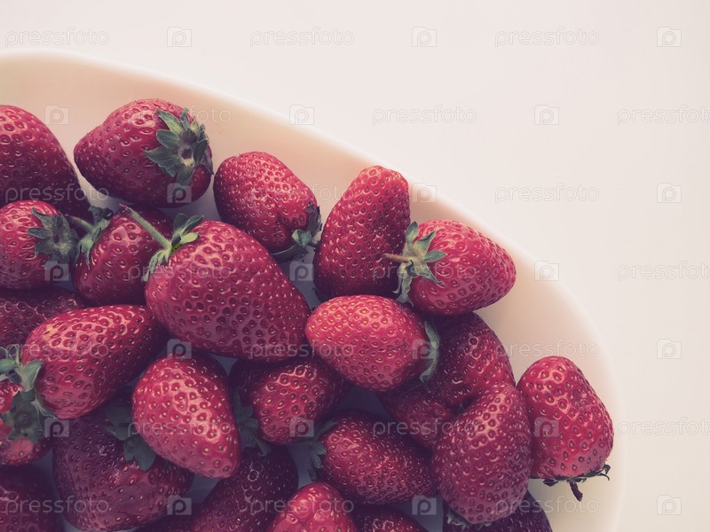 Клубника на тарелке, на белом фоне. Белая посуда и вкуснейшая красная крупная садовая клубника. Здоровое питание, витамины и вегетарианская диета. Натюрморт с едой. Копирование пространства. Плоская планировка