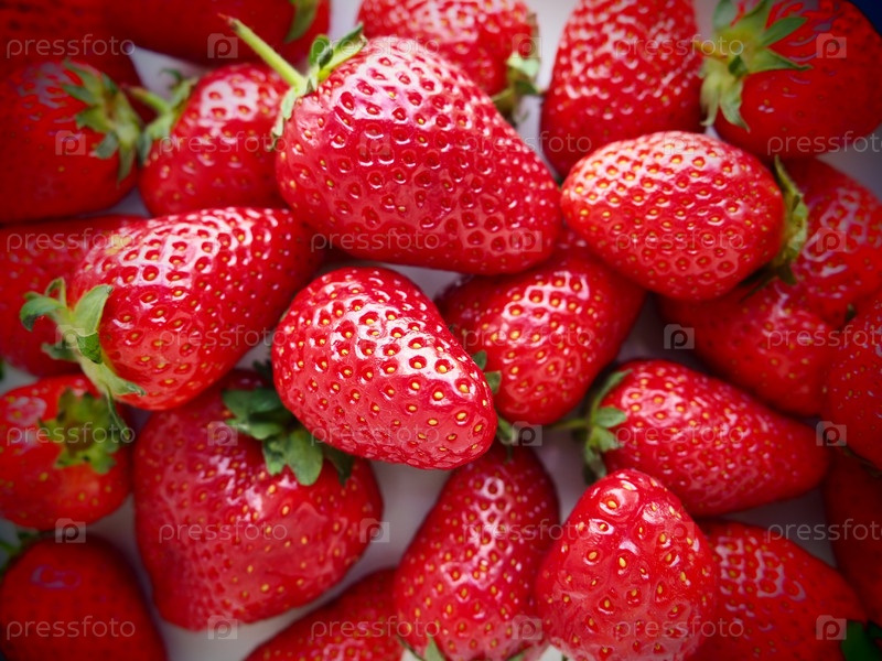 Клубника. Клубничный фон. Вкусные спелые красные крупные ягоды садовой клубники. Здоровое питание, витамины и вегетарианская диета. Натюрморт с едой. Копирование пространства. Плоская планировка
