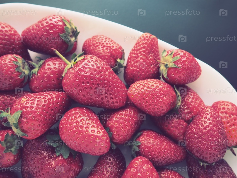 Клубника на тарелке, черном фоне. Белая посуда и вкуснейшая красная крупная садовая клубника. Здоровое питание, витамины и вегетарианская диета. Натюрморт с едой. Копирование пространства. Плоская планировка