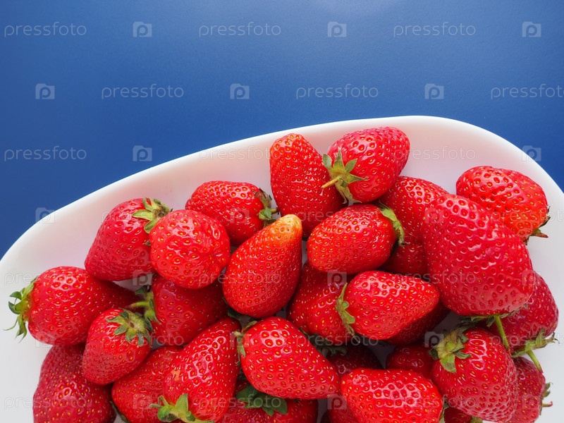 Клубника на тарелке, синем фоне. Белая посуда и спелая вкусная красная крупная садовая клубника. Здоровое питание, витамины и вегетарианская диета. Натюрморт с едой. Копирование пространства. Плоская планировка