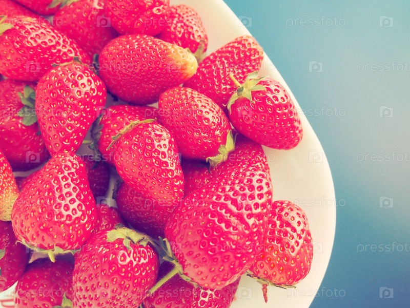Клубника на тарелке, сером фоне. Белая посуда и вкуснейшая красная крупная садовая клубника. Здоровое питание, витамины и вегетарианская диета. Натюрморт с едой. Копирование пространства. Плоская планировка