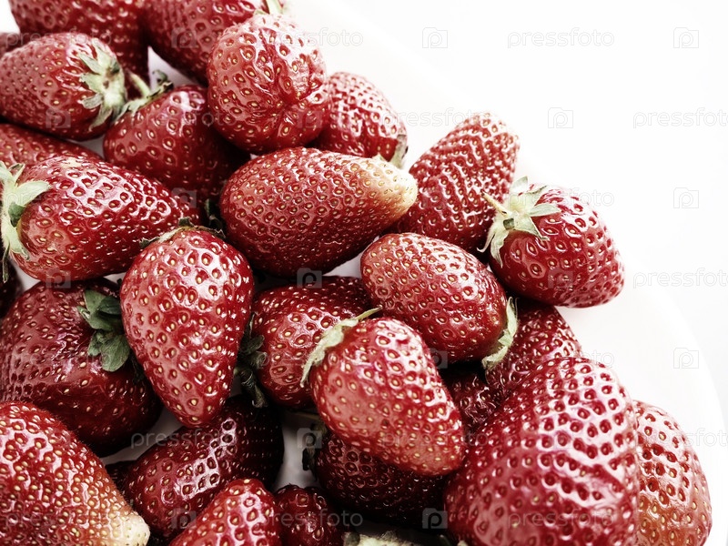 Клубника на тарелке, на белом фоне. Белая посуда и вкуснейшая красная крупная садовая клубника. Здоровое питание, витамины и вегетарианская диета. Натюрморт с едой. Копирование пространства. Плоская планировка