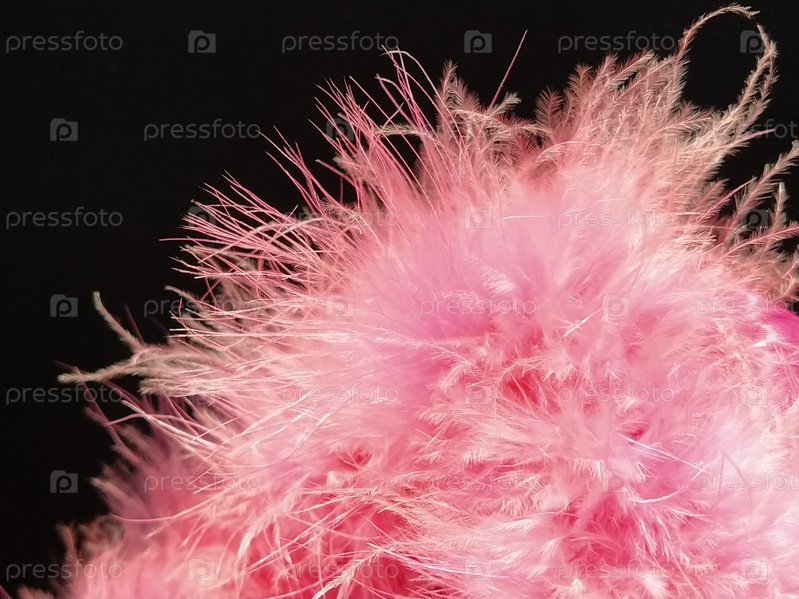 Нежный розовый пух на черном фоне. Настоящий мех с длинным ворсом. Крупный план. Боа или косметическая кисточка. Изящные детали. Мягкий фокус. Размытое изображение