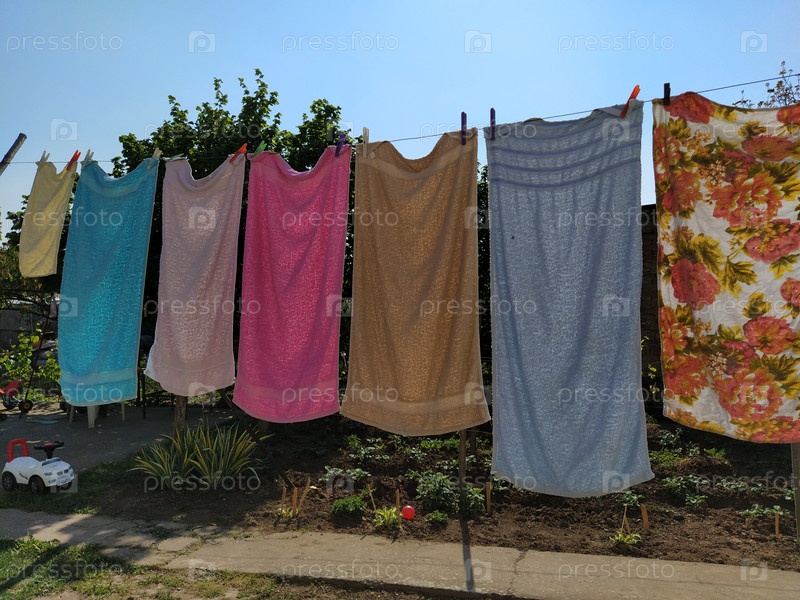 Сремска-Митровица, Сербия, 10 июля 2020 года, полотенца и одежда сохнут на веревке. Домохозяйка волнуется. Влажную тряпку подвешивают на прищепки для дальнейшей сушки. большая стирка