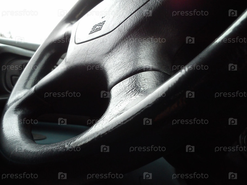 Интерьер автомобиля. Темный руль. Интерьер кабины автомобиля. Темная обивка. Ключи от автомобиля в контактном гнезде. Круглый руль