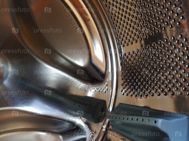 Барабан стиральной машины изнутри. Блестящий металлический резервуар с отверстиями и выпуклостями. Поверхность из нержавеющей стали с отверстиями, изготовленная из листа нержавеющей стали. Внутренний вид стиральной машины