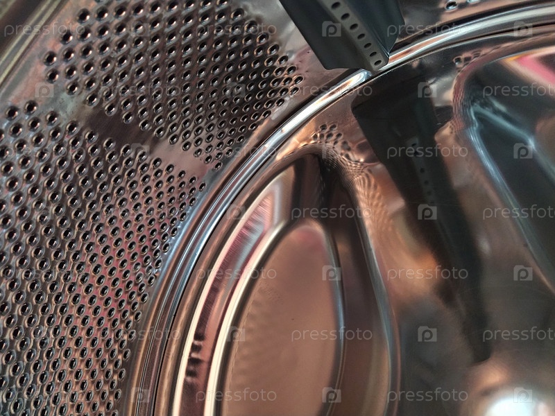 Барабан стиральной машины изнутри. Блестящий металлический резервуар с отверстиями и выпуклостями. Поверхность из нержавеющей стали с отверстиями, изготовленная из листа нержавеющей стали. Внутренний вид стиральной машины