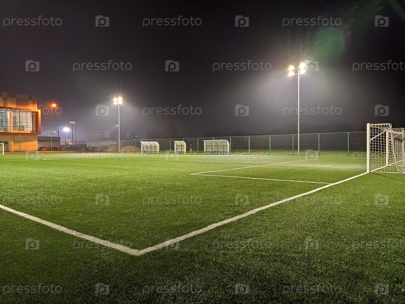 Стадион в огнях и вспышках. Пустое красивое футбольное поле со светящимися прожекторами вечером или ночью. Искусственный газон. Эффект тумана или дыма. Футбольные ворота
