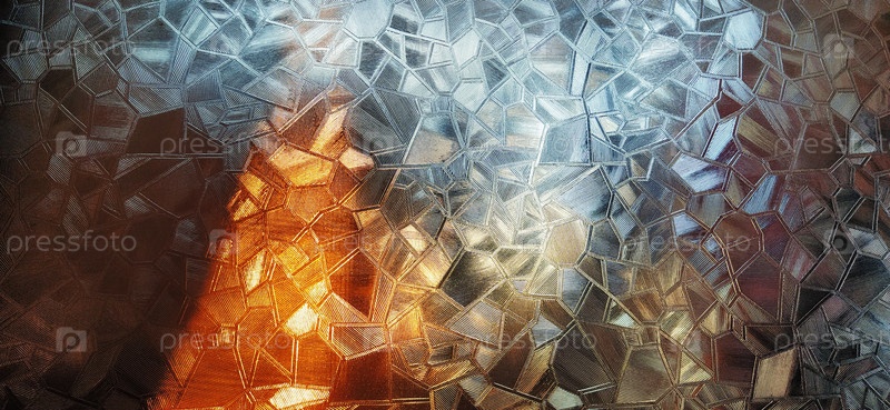 Гофрированное стекло с подсветкой. Красивое преломление света в красном, коричневом, желтом, оранжевом и черном цветах. Абстрактный фон для самоклеящихся пленок. Ребристая стеклянная поверхность