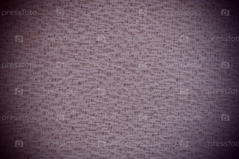 Прозрачный тюль бледно-сиреневого или фиолетового цвета в виде сетки. Сетчатая ткань. Крупный план. Вуаль или муслин. Крупный план занавески с отверстиями разного размера. Абстрактный фон. Темное виньетирование по краям