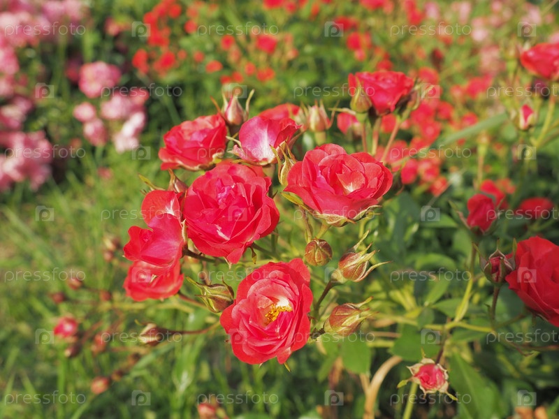 Крупный план куста красных роз в летнем саду под солнечным светом. Красные кустовые розы с множеством бутонов и распустившимися цветками. Клумба в парке, способ украшения улиц и пейзажей