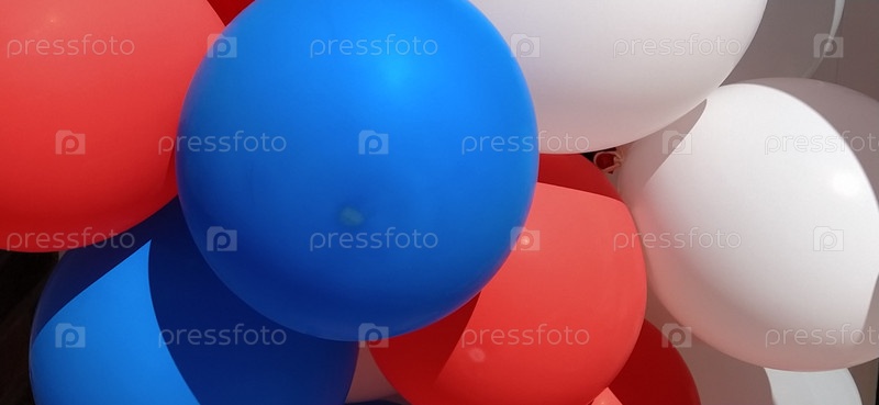 Надувные шарики. Яркие синие, красные, белые гелиевые латексные шары. Группа воздушных шаров для оформления детского праздника, дня рождения, открытия нового магазина. Внутренняя и внешняя отделка