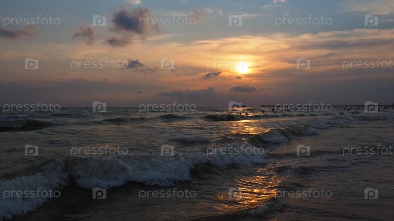 Закат над морем. Красивые волны на закате. Туристическая Мекка, курорт. Вечернее небо. Лучи отражаются от воды