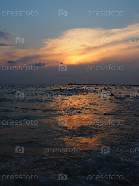 Закат над морем. Красивые волны на закате. Туристическая Мекка, курорт. Вечернее небо. Лучи отражаются от воды