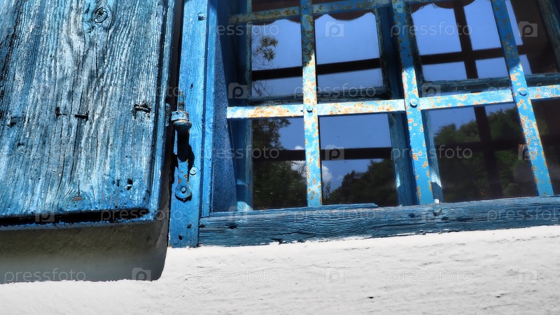 Старые деревянные ставни открыты. Деревянные оконные рамы и ставни окрашены в синий цвет. Белая бетонная стена. Традиционная деревенская архитектура. Стеклянное окно. Тршич, Лозница, Сербия