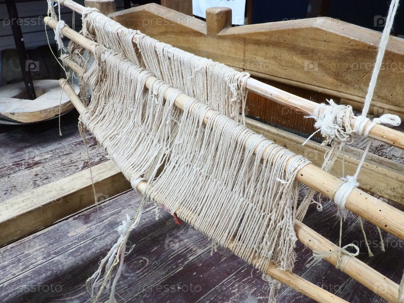 Ткацкий станок и нитки. Антикварное оборудование для производства ковров, одежды и тканых предметов домашнего обихода. Нити и пряжи натягиваются на втулки и рейки. Тршич, Лозница, Сербия. Этнотуризм