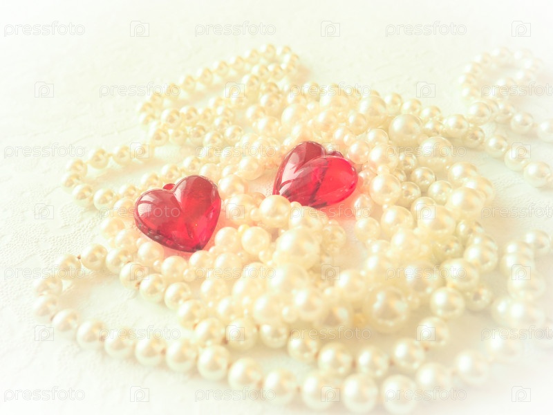 Валентинские сердечки. Красные пластиковые прозрачные сердечки. Жемчужные бусины. Поздравительная открытка с белым фоном к празднику Дня святого Валентина. Выражение любви. Копирование пространства. Плоская планировка. Рифленый фон