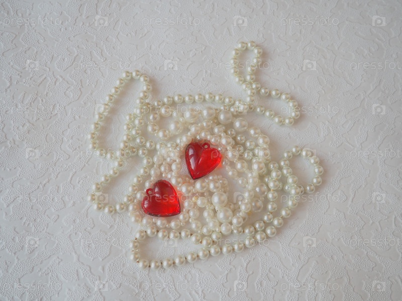Валентинские сердечки. Красные пластиковые прозрачные сердечки. Жемчужные бусины. Поздравительная открытка с белым фоном к празднику Дня святого Валентина. Выражение любви. Копирование пространства. Плоская планировка. Рифленый фон