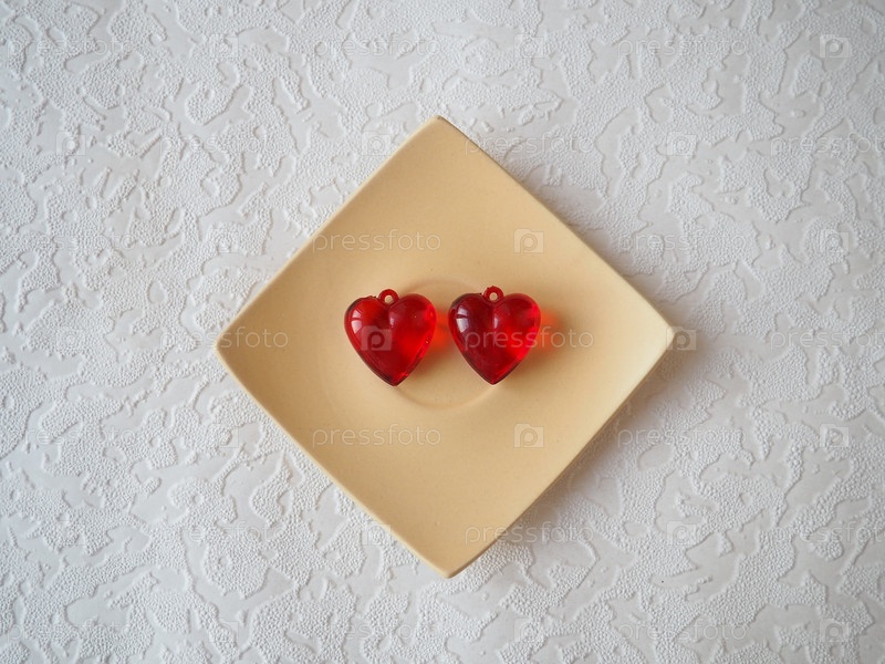 Валентинские сердечки. Красные прозрачные пластиковые сердечки на белой квадратной тарелке. Поздравительная открытка с белым фоном к празднику Дня святого Валентина. Выражение любви. Копировать пространство