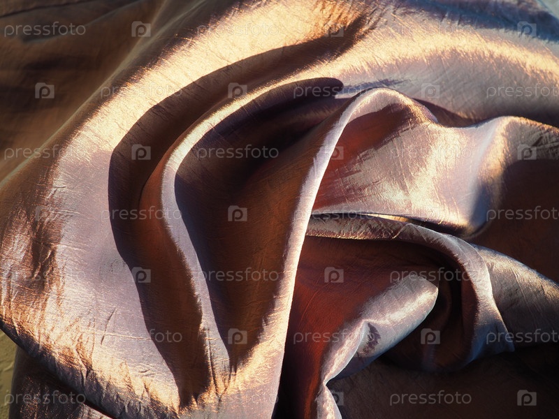 Красивая ткань - тафта, аккуратно сложенная волнами. Мятый материал, похожий на шелк или парчу. Перелив и цветовой градиент при разных углах освещения. Ткань для пошива одежды и штор