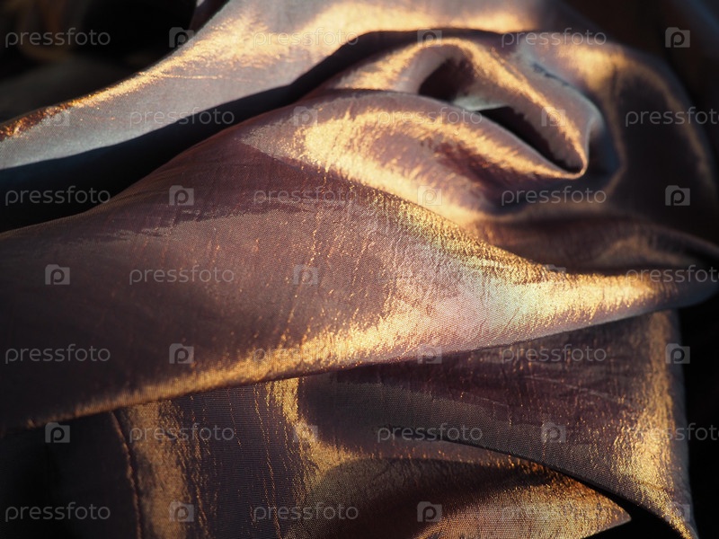 Красивая ткань - тафта, аккуратно сложенная волнами. Мятый материал, похожий на шелк или парчу. Перелив и цветовой градиент при разных углах освещения. Ткань для пошива одежды и штор