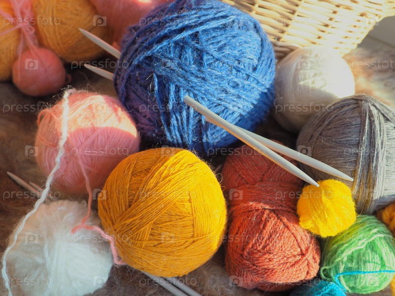 Вяжем шарф или свитер из серой, синей, белой и оранжевой пряжи. Мотки шерстяных и акриловых ниток. Вязание как хобби. Аксессуары, спицы, крючки