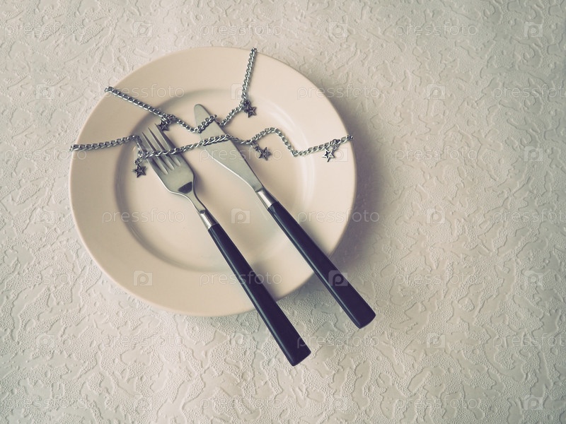 Пустая тарелка, вилка, нож на белом фоне. На столовые приборы небрежно наброшена серебряная металлическая цепочка. плоская планировка. Натюрморт