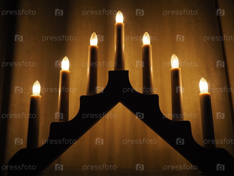 Арочный светильник Швиббоген в форме треугольного подсвечника. Желтый фон. Вечерняя, романтическая, праздничная, религиозная или мистическая атмосфера. Горящие лампочки, напоминающие свет свечей