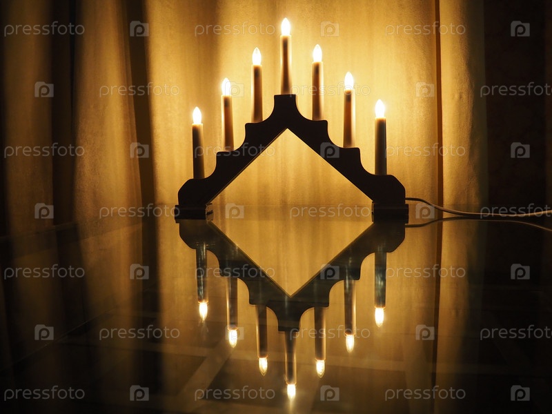 Арочный светильник Швиббоген, треугольный подсвечник на стеклянном столе. Желтый фон. Вечерняя, романтическая, праздничная, религиозная или мистическая атмосфера. Горящие лампочки, напоминающие свечи