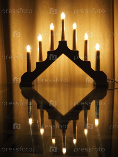 Арочный светильник Швиббоген, треугольный подсвечник на стеклянном столе. Желтый фон. Вечерняя, романтическая, праздничная, религиозная или мистическая атмосфера. Горящие лампочки, напоминающие свечи