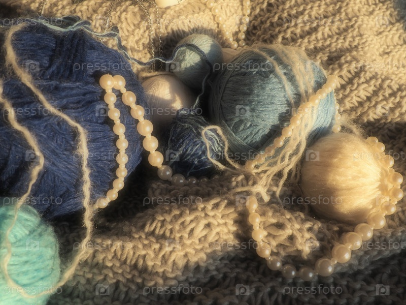 Отрезки пряжи и ниток на фоне вязаного изделия. Бежево-голубые цвета из шерстяных и акриловых ниток. Жемчужные бусины лежат на шариках. Натюрморт