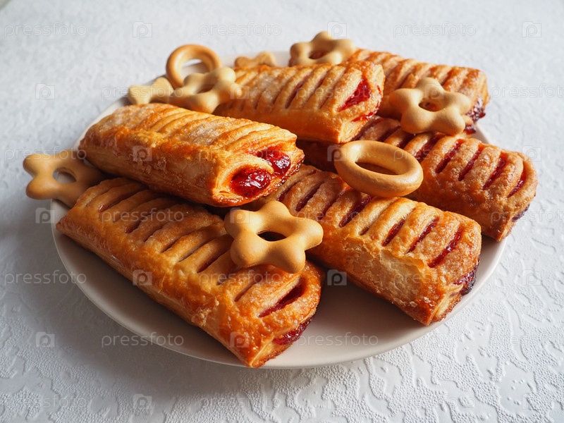 Вишневые пироги на тарелке. Сушки и печенье