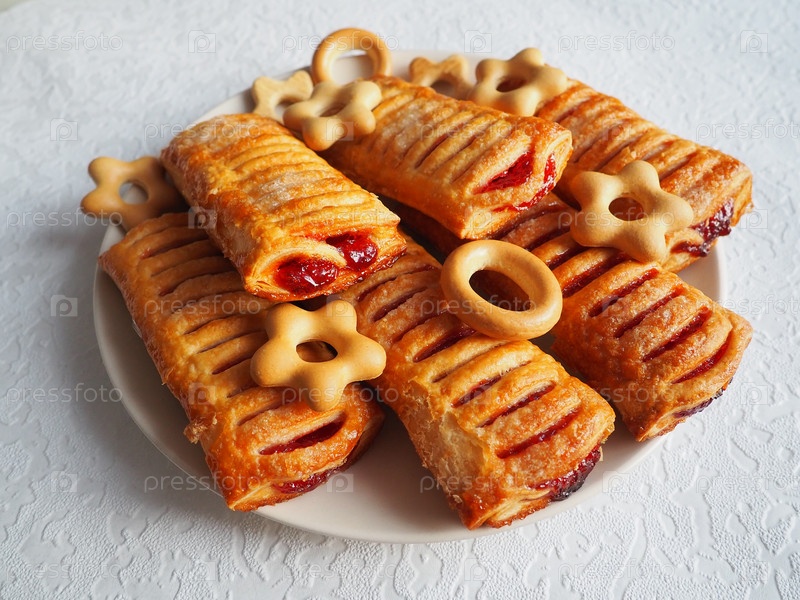Вишневые пироги на тарелке. Сушки и печенье