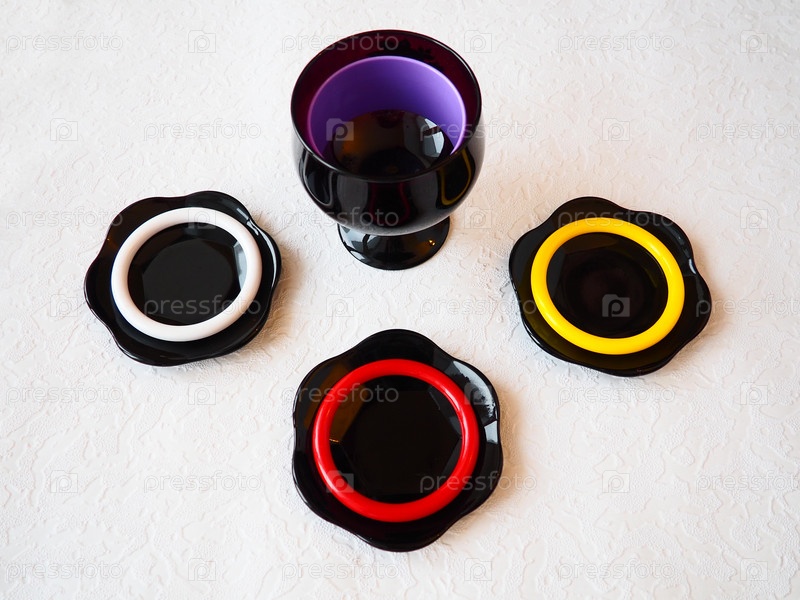 Плоская стеклянная черная посуда, пластиковые разноцветные браслеты на белом фоне. Чаша и 3 блюдца