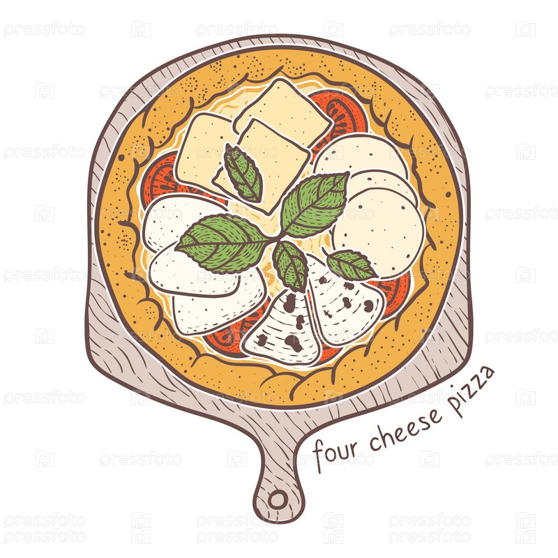 Пицца «Четыре сыра» с рикоттой, моцареллой, пармезаном и горгонзолой, эскиз иллюстрации