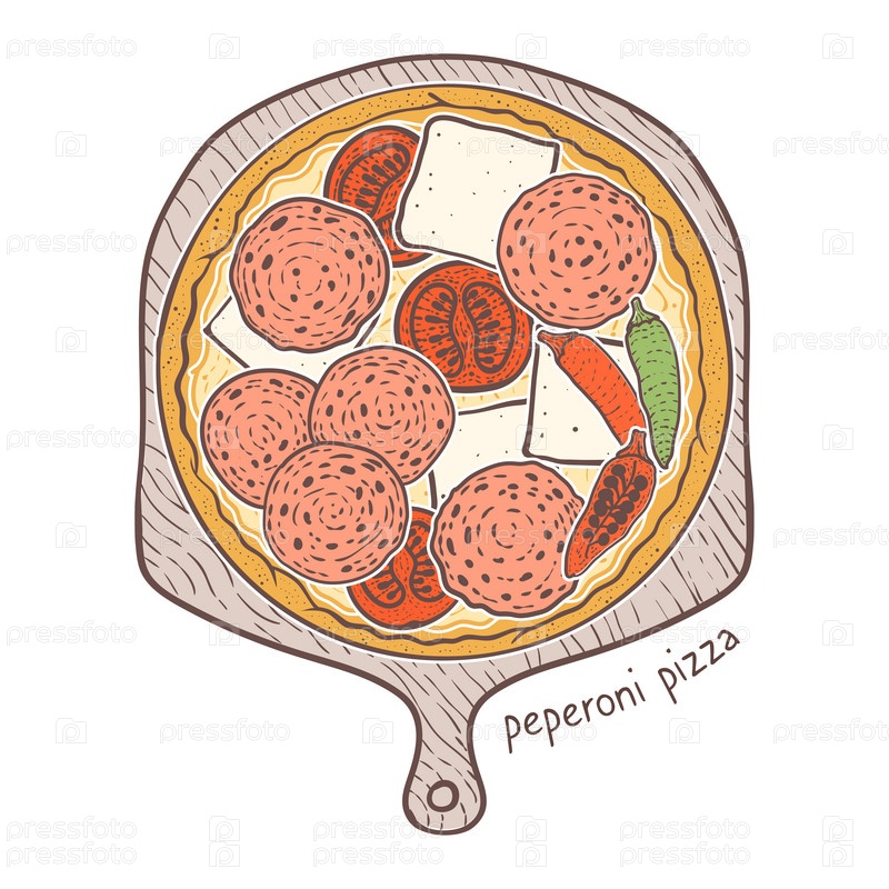 Пицца Пеперони с горячей салями, моцареллой и помидорами, эскиз иллюстрации