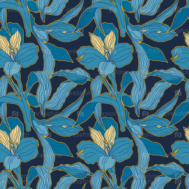 Темно-синий бесшовный узор с высокодетализированными бутонами и цветами альстромерии