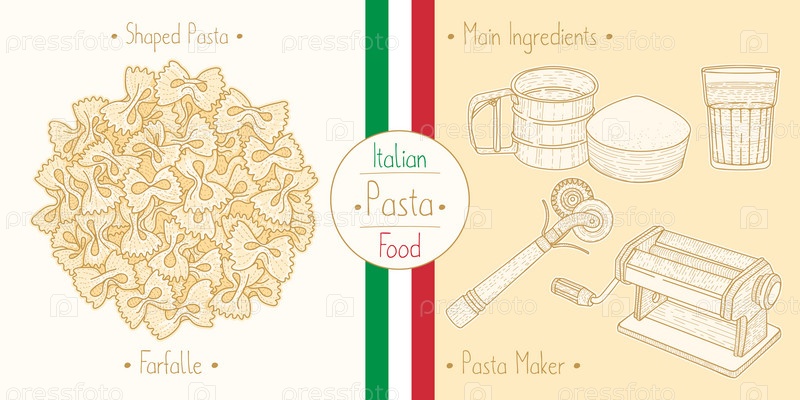 Приготовление итальянской еды, галстук-бабочка, макароны Farfalle, ингредиенты и оборудование