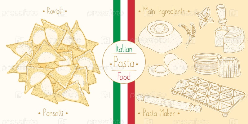 Итальянская пищевая паста с начинкой равиоли Пансотти, эскиз иллюстрации в винтажном стиле